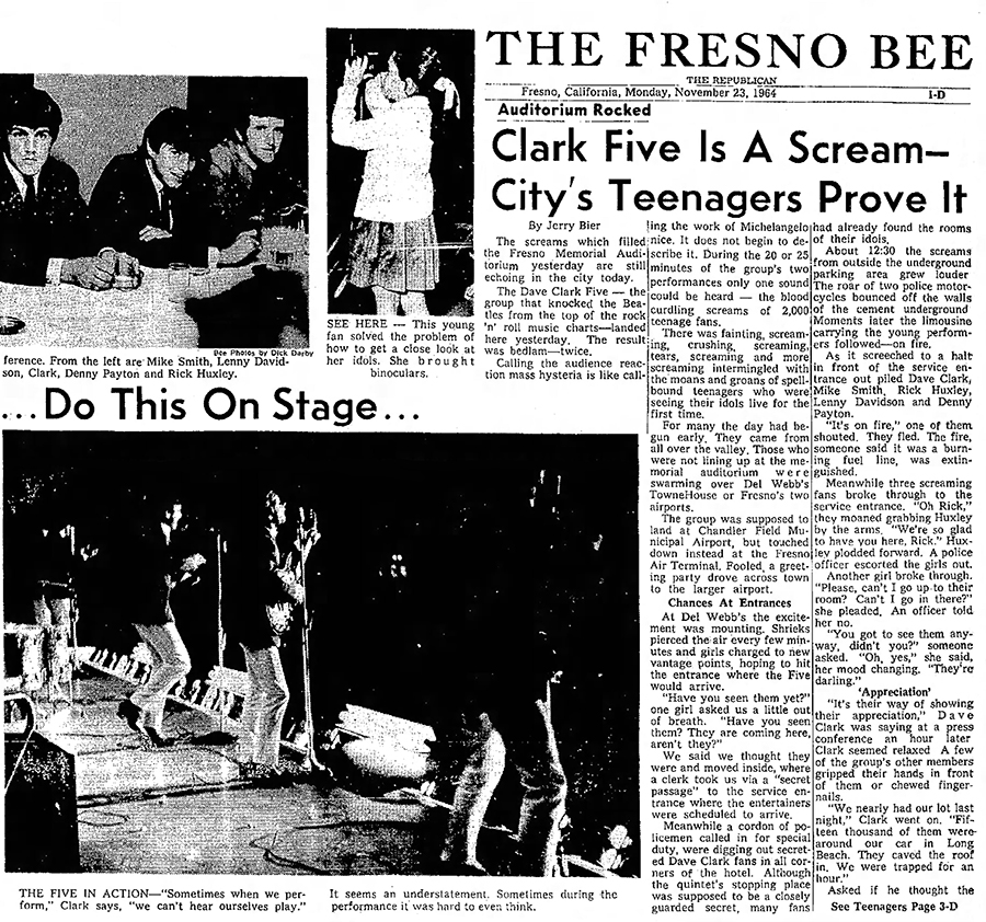My goodness Jim, really? At the risk of ruining one of your favorite teenage memories, there is no record of the Beatles playing at the Memorial Auditorium or even in Fresno for that matter. Just goes to prove you can't believe everything you read on the internet. Now, the Dave Clark Five at the Memorial Auditorium is a different matter. In the article below, they even reference how the Dave Clark Five beat out the Beatles.