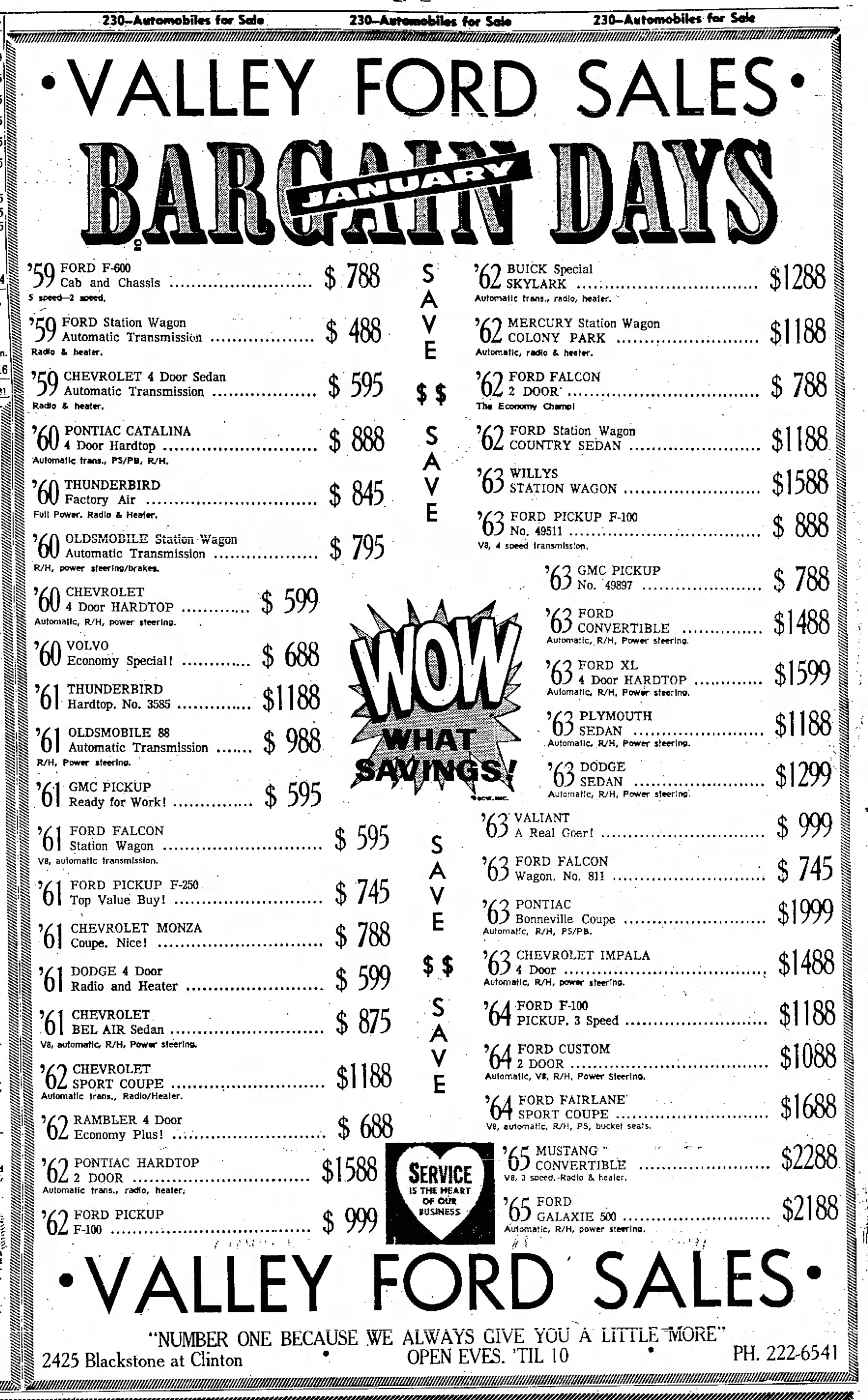 In '64 and '65 it was fun to go down and look at the Galaxies on the lot. Those are my two favorite Galaxie years. The '64s were prettier, but the '65s had better suspensions. I remember a green '64 convertible that was under $3K. The '65 Impala was an outstanding car, too. The thing that made me choose Ford was the fact that the distributor was in the front of the engine, not the back, making for easier tuning. I remember Frontier Chevrolet, the huge dealership at the corners of Abby, Divisadero, Stanislaus, and P Streets. It was the first one I had seen that was a 2 story building. Hallowell Chevrolet was in Clovis. I remember the jingle that Valley Ford used for advertising:
