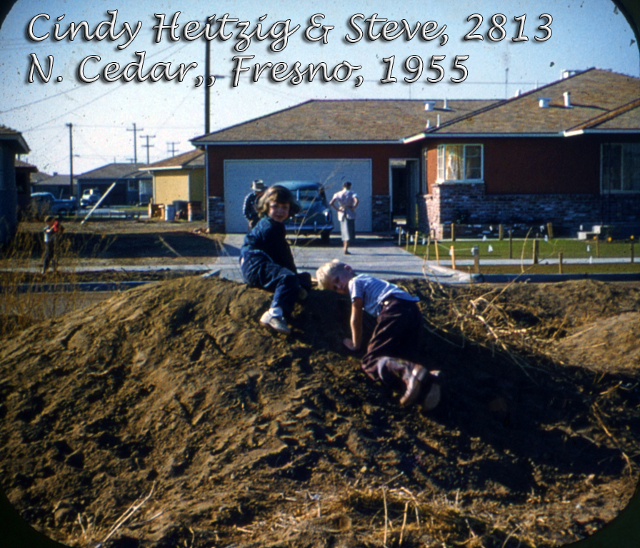 This is the brand new subdivision at the corner of North Cedar and Princeton.  We're building a fort beneath that huge ugly metal power tower that sits there.  At the time McLane (to the left, out of picture) was a vineyard.  The gold house in the background was owned by Kal and Elaine Kalkowski.  Kal was the commander of the Air National Guard Base in Fresno.  Cindy's dad, Lee, was a tire dealer and owner of Heitzig and Shirkey in Fresno.