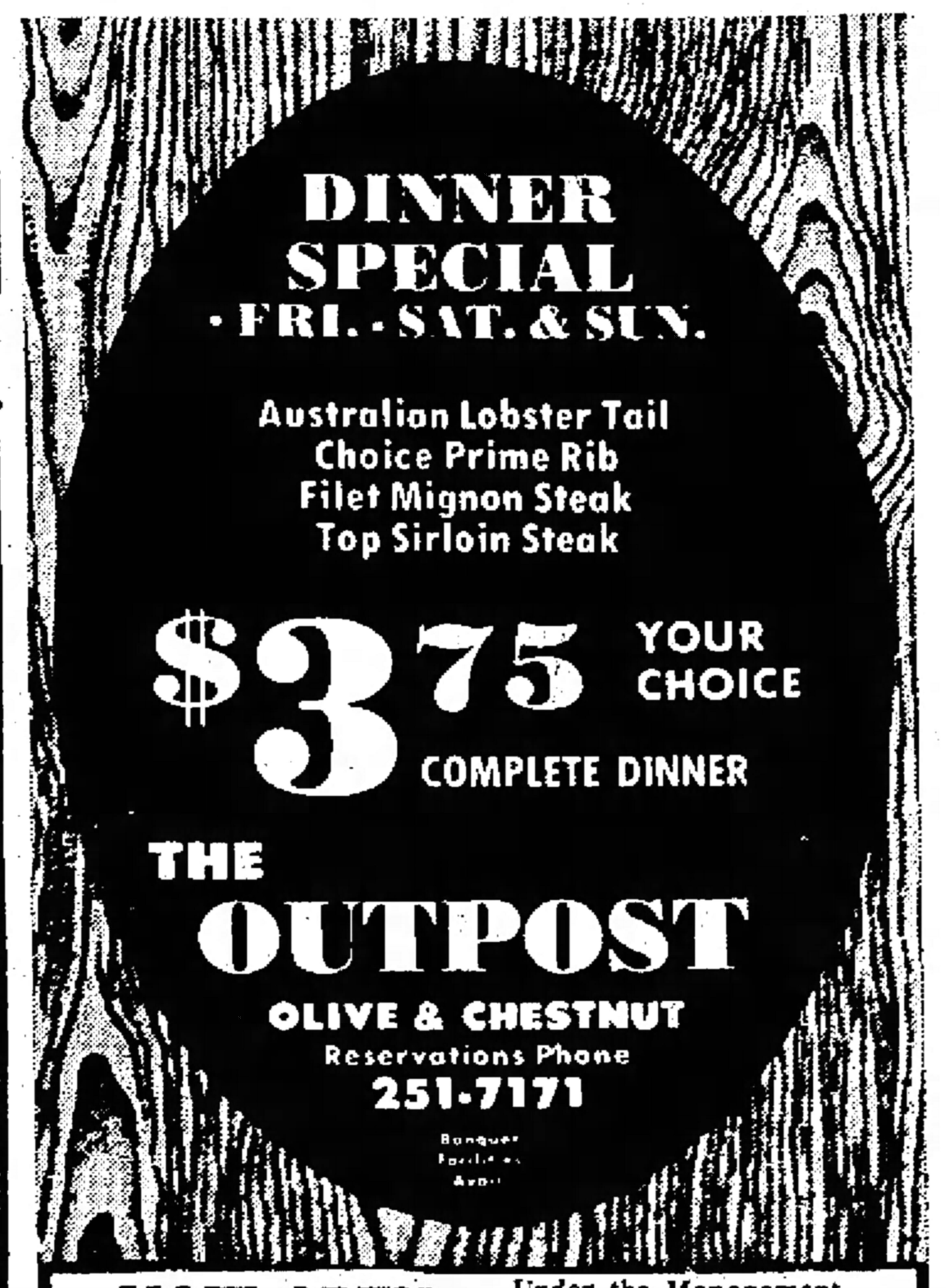 The Outpost was definitely on Chestnut and Olive. I took my date there on prom night 1980. They were different in the restaurant business in Fresno in that they closed every year for the month of October. They refused to compete with the Fair. Smart!