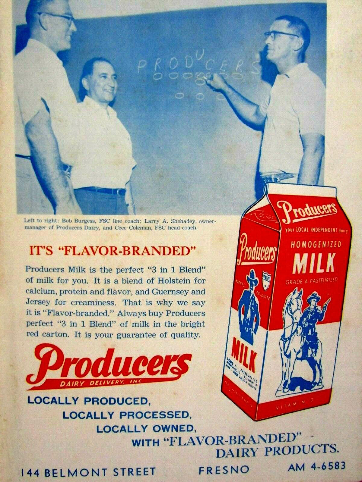 In this magazine advertisement, we see Cece Coleman, the Fresno State College Bulldogs Coach, chalking a play on the blackboard which somehow underscores that it is "Flavor Blended". I got a chuckle out of it anyway.