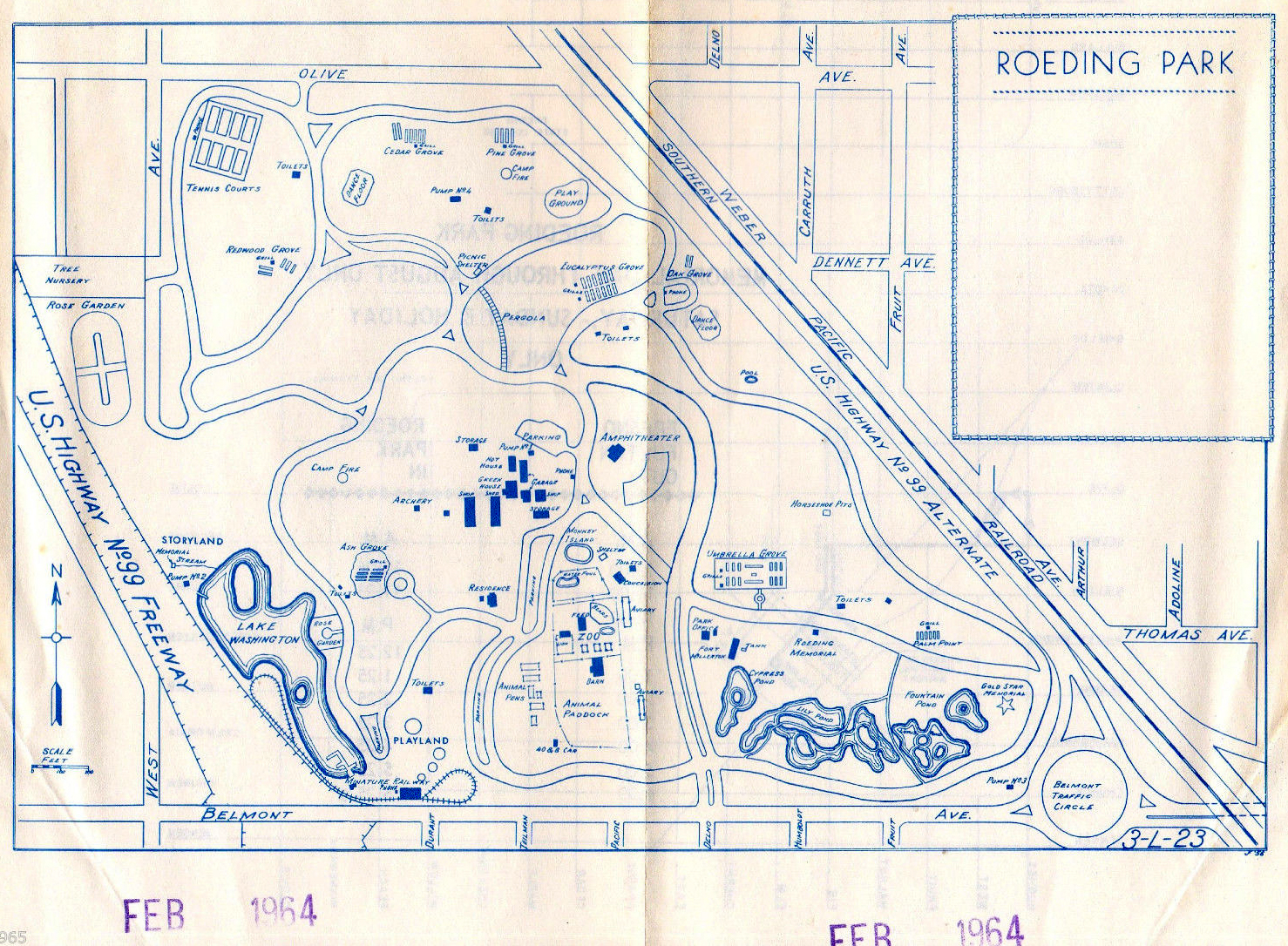 Here is a map of Roeding Park dated 1964. I can see the miniature train tracks at the lower left. Although I grew up in Fresno in the 50s and 60s and went to Roeding a hundred times, I never had the honor of riding that train!