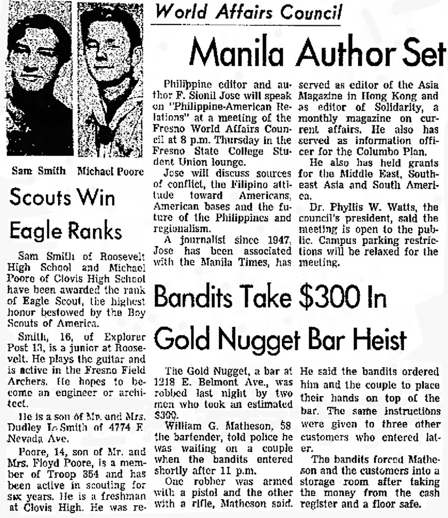 Does anyone remember a bar called "The Gold Nugget"? It was located at the corner of Park and Belmont. It was a rather old sleazy place where you could spit on the floor, and nobody noticed. I closed up the joint more times than I can remember. It was torn down in the early '70s to make the on-ramp to the freeway. There was a veterinarian clinic next door.