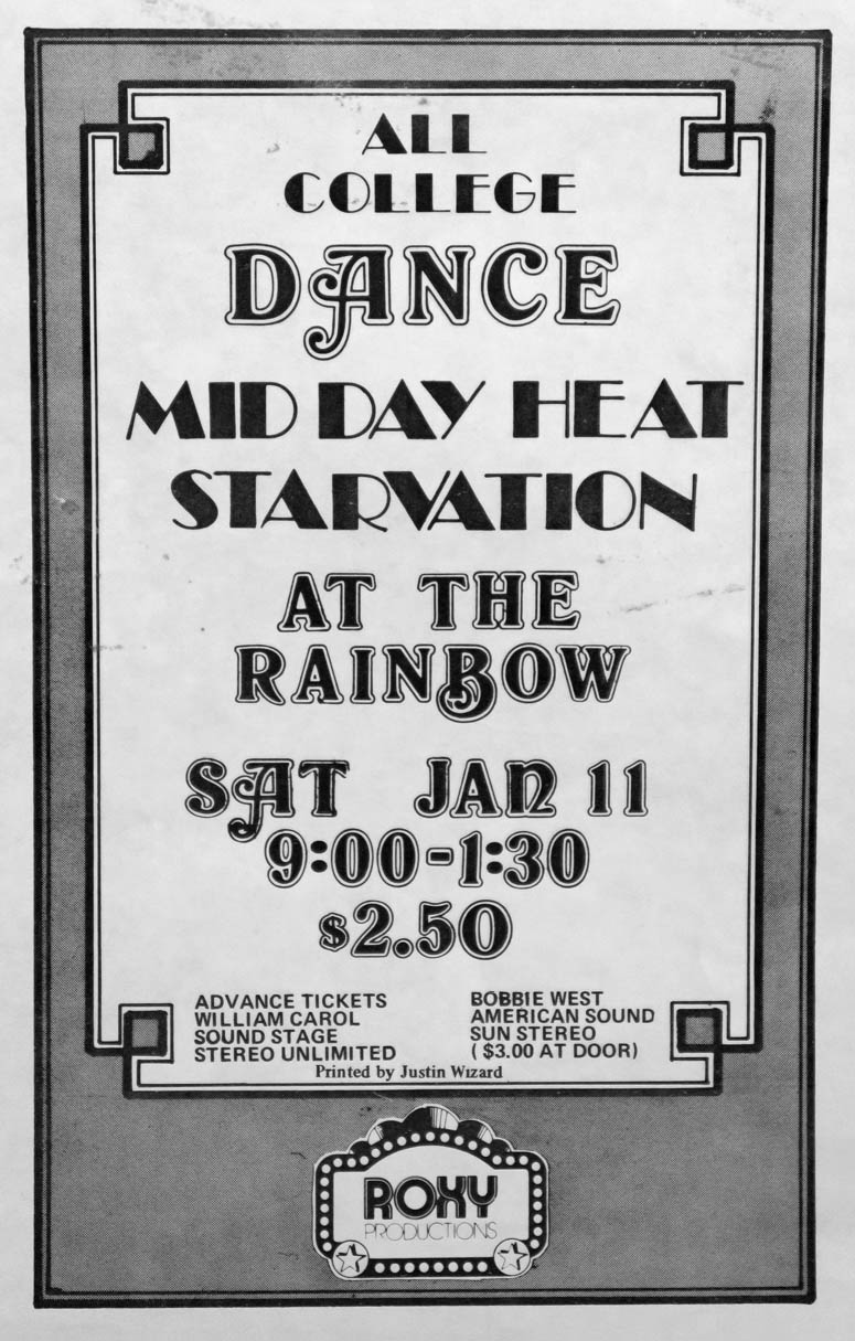 Back in 1975 I went to the Rainbow a few times because a friend's band was playing, Midday Heat. It seemed like a decent enough place and the area around the Rainbow wasn't as dilapidated as it is now. Midday Heat was a McLane High School group of guys, led by a heck of a guitarist, Jim Lum. Lum went on to become a professional session guitarist in Los Angeles. They were a cover band, playing the hits of the day, especially tunes by Cold Blood, Chicago and the other horn bands you could hear on the radio at the time.