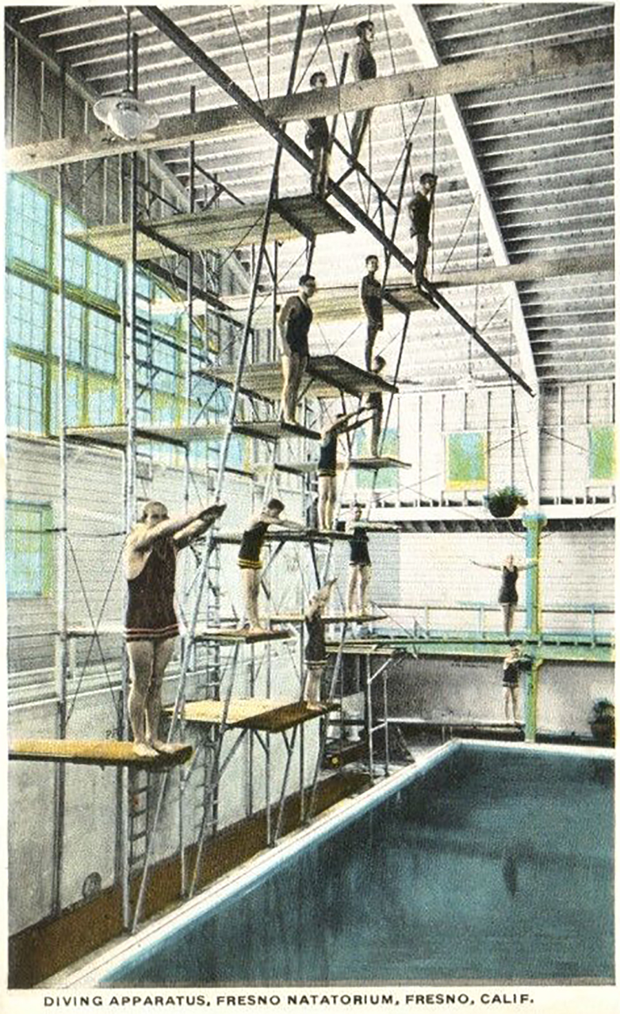 The Rainbow Ballroom building was constructed in 1918 as the "Fresno Natatorium", an indoor swimming pool. In 1930, the pool was closed and boarded over. Directly underneath the current dance floor is the pool (or what is left of it).