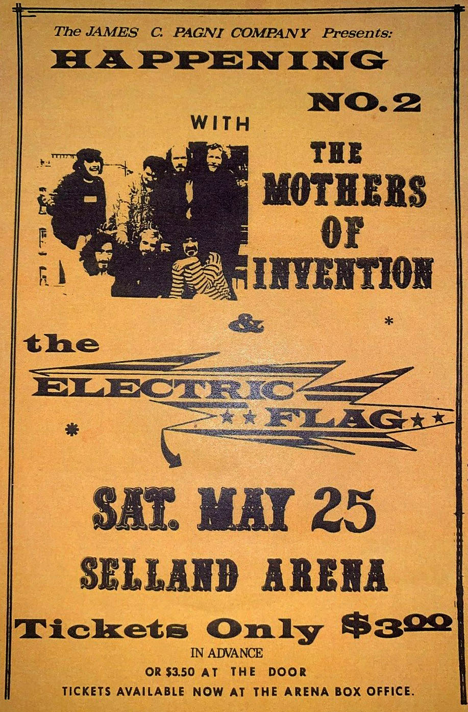 Handbill from Saturday, May 25, 1968 featuring the Mothers of Invention and Electric Flag at the Selland Arena