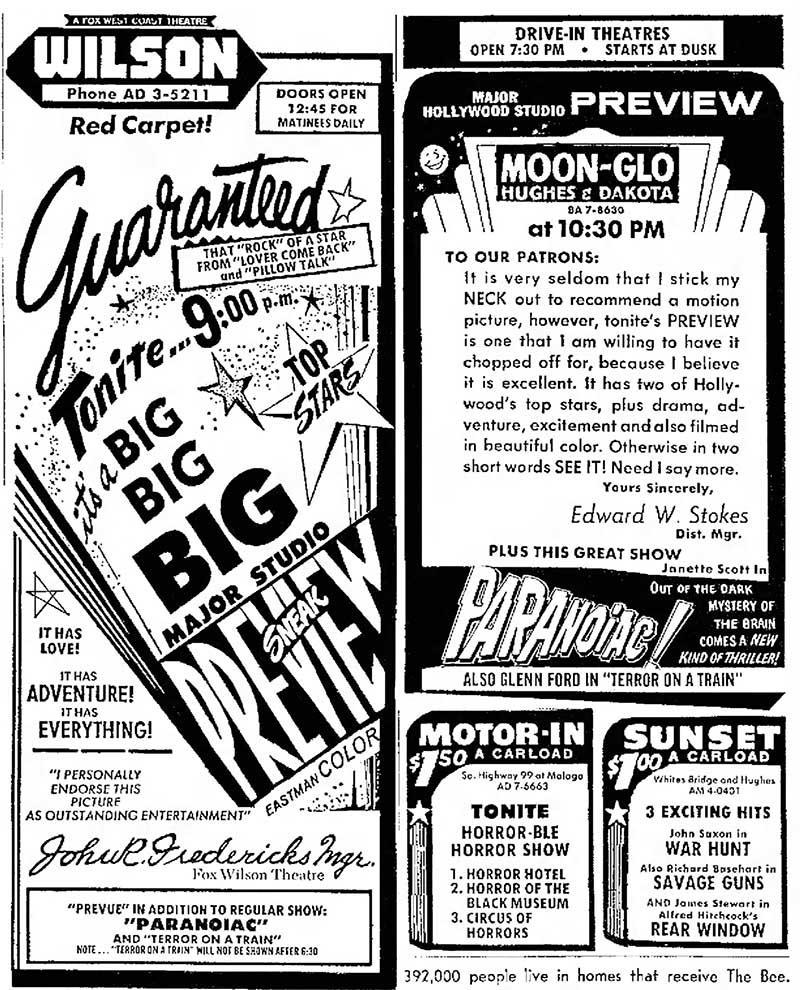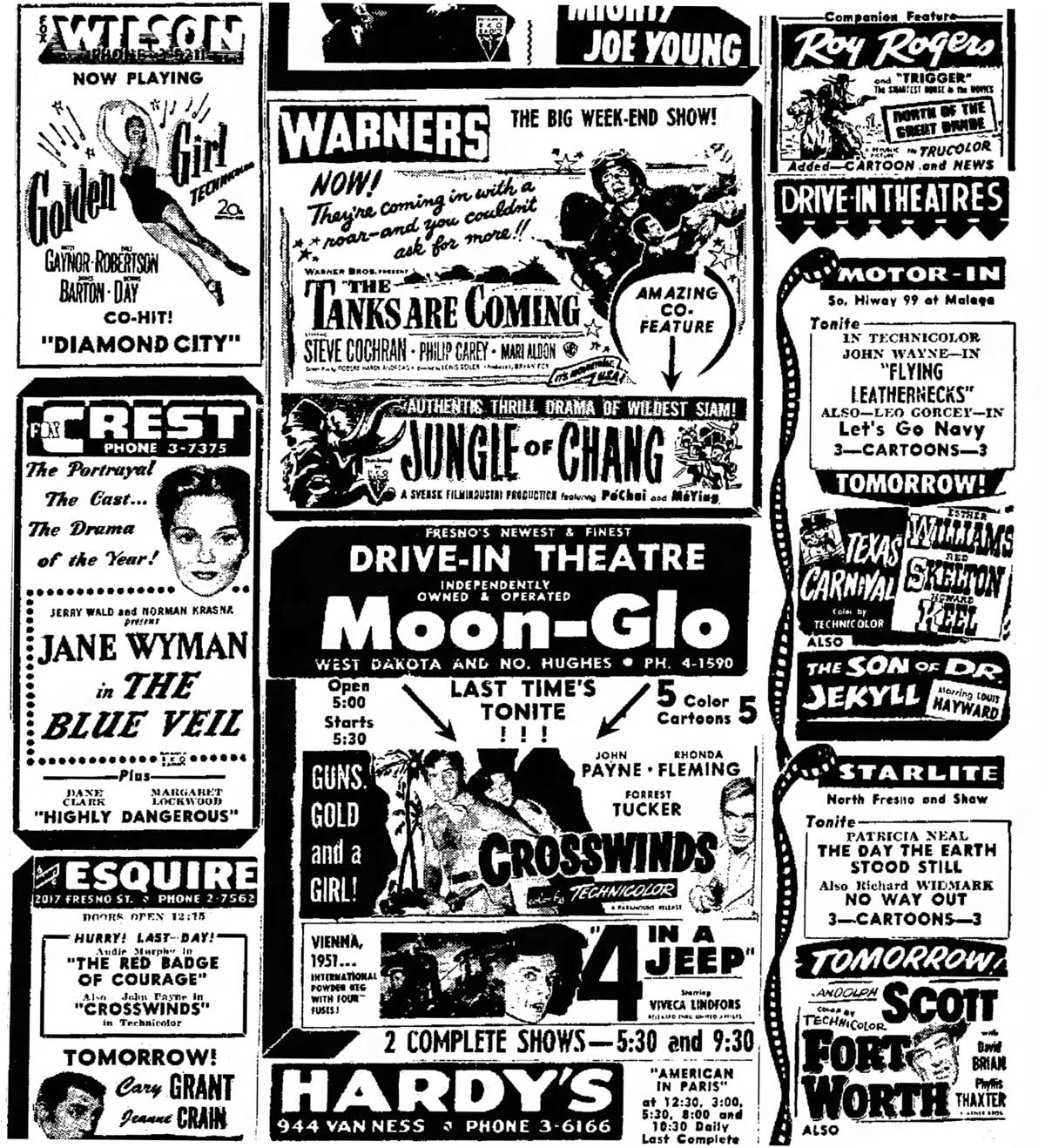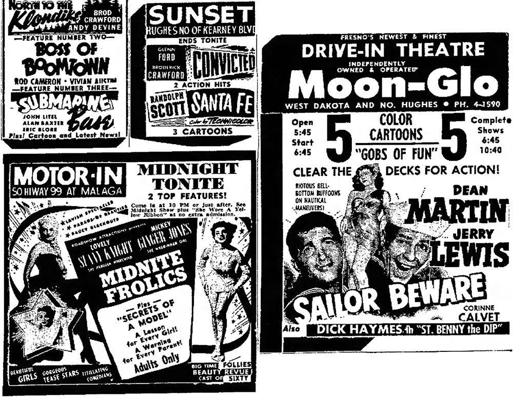 I grew up during the hay day of the movie drive-in phenomena. Before I learned to drive, I remember climbing on top of our roof to see the Moon-Glo screen, way off in the distance. My house was near the Ashlan Parking Shopping Center and the screen was on Dakota Ave. which didn't seem that far away. I hatched a scheme to buy a parabolic listening dish with ear phones that I saw for sale in my comic book. I figured I'd be all set to watch and hear movies for free. Of course, that was nuts and only a dream.