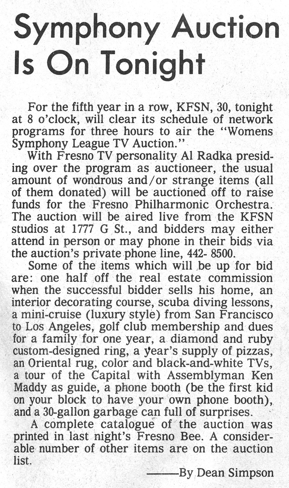 I moved from the town I grew up in around 1972 and missed the years when Al hosted his 3 hour auctions for the Fresno Philharmonic Orchestra. I have no doubt that it was quite a "fun time" to watch Al Radka in his full glory of continuous adlibs. I'm sure readers of this forum remember these auctions as they happened for a number of years in a row.