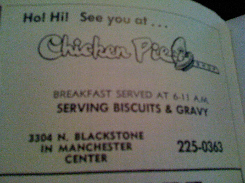 Hello Big J. The Chicken Pie Shop, note there is no "POT" in the name, is known officaly as Grandmarie's Chicken Pie Shop. It opened at 861 E Olive Ave in 1946 and not only is it in the orginal location but I've never heard that they ever opened any other locations. However, I have spent my adult years living elsewhere so if you know that they were in Manchester Center at one time, please confirm that.