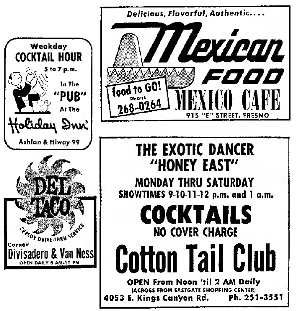 I never made it to the Mexico Cafe, maybe it was just to far away from the Cedar and Shields area where I lived. Also, I don't remember hearing anything about it but then my focus on Mexican food was limited to Taco Bell. I did find this old ad in the Bee from when the owners remodeled the restaurant. They were certainly in business for a very long time in Fresno.