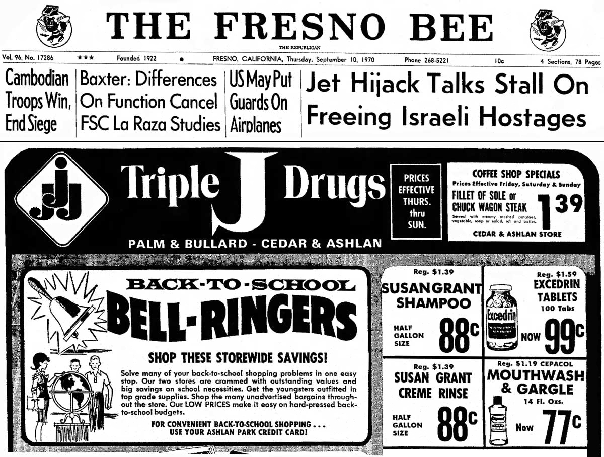 I found this ad which shows two locations for Triple J's but I only ever went to the Cedar and Ashlan one. It was a 15 minute walk from my childhood home but it seemed like a long trek back in the day. PS: I added the front page banner above this ad. We love the Fresno Bee here at Lost Fresno!