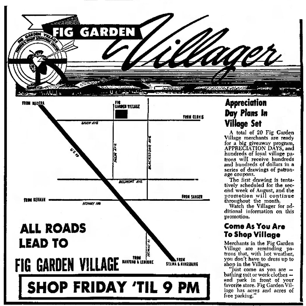 I loved Fig Garden Village too! What other shopping center said "old money" like this one did? And that includes shopping centers and strip malls of today as well. In the ad below called "The Villager" you are encouraged to come in your bathing suit if you prefer - no need to dress up!