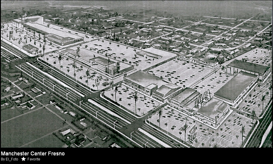 I remember Manchester well. Mayfair Market was at the center of it in the beginning. It had a fountain that my mom and I drank chocolate sodas at. I remember getting lost in Rhodes (more than once) when I was very young. There was Party Tips next to Perry Brothers (I think). Once I found a box of silver gift ribbon in the parking lot. My family used that ribbon for years. There was a GREAT candy store there, very old fasioned etc. They held the Fresno World's Fair (who remembers those?) in the parking lot once.