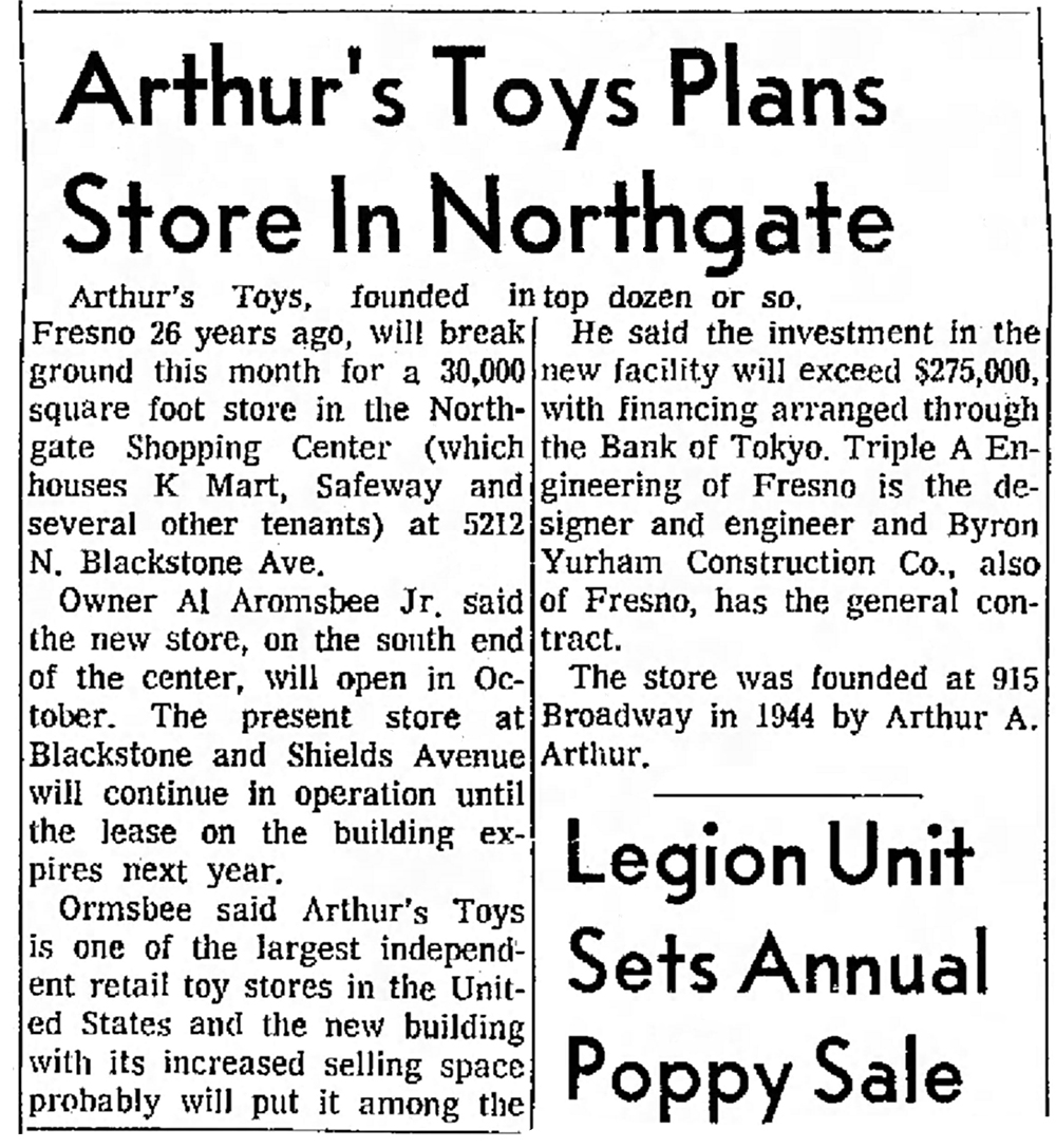 I remember clearly today, when I was living in the neighborhood of Palm & Clinton in the late 1960's When I was done collecting for my newspaper routes from the Bee and Fresno Guide, I would ride my bike all the way over to Shields and Blackstone. First I'd get a double cheeseburger, fries, and a Chocolate shake from McDonalds. When finished, I go across the way to Arthur's Toy's and spent agonizing time over which military Airfix military figure sets I'd buy. Most of them costs only $1.00 each. What a shame when Arthur's Toys was sold. Some years later I moved to Bakersfield and found that the new owner had opened a store next to Montgomery Wards. Sometime after that the store burned down under mysterious circumstances. The then owner was charged with Arson.
