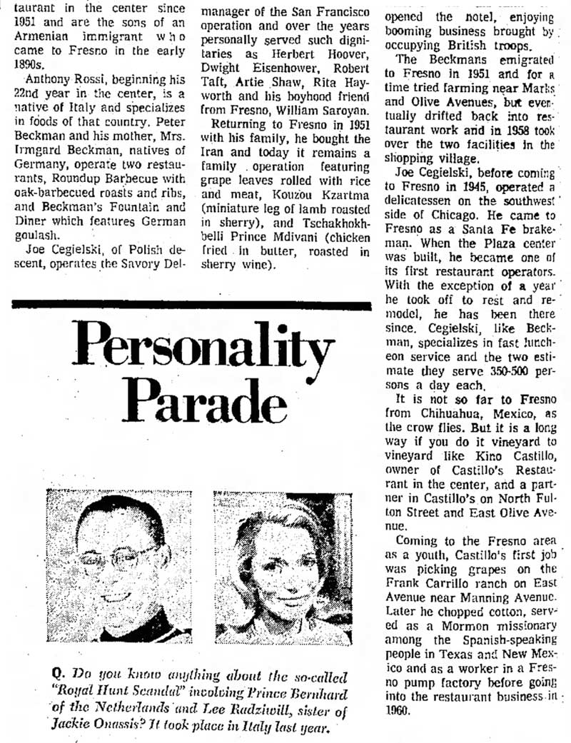 I remember the best Armenian food was in the round-roofed corner, where the lamb shanks were pure poetry along with the pilaf and grape-leaf roll-ups. I remember taking friends there for a true Fresno Experience, and a celebration dinner after we purchased a brand new Volvo station wagon after having endured 10 years with a VW "bug". We felt so darn rich that evening, and lamb shanks were just the ticket for a feast. The brother of the owner of this restaurant ran a little diner across the street from the Del Webb, where my boss had his architecture office. The brother's Lulu kebabs were absolute heaven, our payday treat for us worker bees.