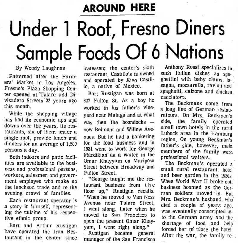 You have to be kind of old to remember this, but before there was an indoor food court at Tulare and Divisidaro (with Dai Ichi and magazine store, etc etc) there was a Mayfair grocery store with an attached pavilion. A covered structure which always made me think of a carnival tent with picnic tables, with all kinds of food vendors. That was in the 60s and that's the place I remember most. They had an Italian sandwich place that rocked. Anyone remember what else was there?