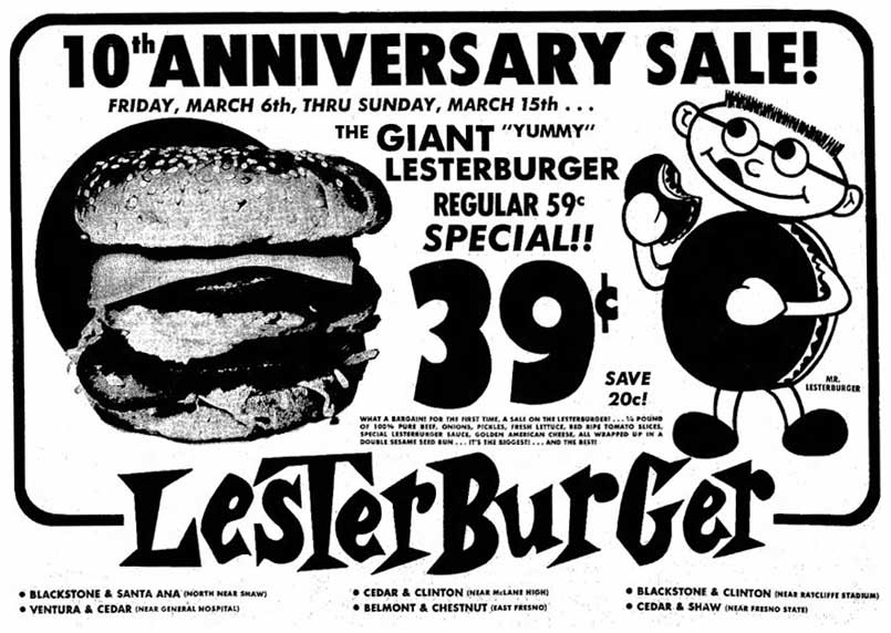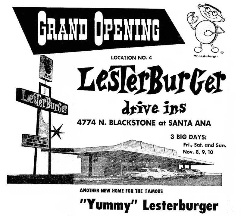 The original Lesterburger was at the corner of Cedar and Tulare across the street from Roosevelt High School. The building was demolished when they widened Cedar.What kind of progress is that? Although, I think Lesterburger was out of business by then.