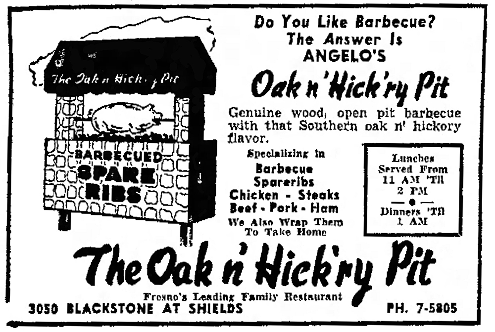 I remember it well. My dad loved going there. He liked the rustic atmosphere, and the bibs they gave us, indicating it was ok to make a mess. In the early 50's, I was living at the Fresno State girls' dorm, located at Maroa and Home. One weekend some of the girls were trying to decide where to eat out. Someone suggested the Oak N Hickory Pit. Someone else whined, "It's so far out." It's weird to think that Blackstone and Shields seemed almost out in the country then, and now seems almost downtown.
